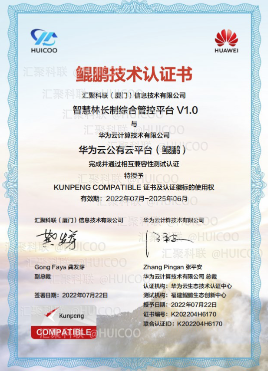 匯聚科聯(lián)自主研發(fā)的“智慧林長制綜合管控平臺1.0”與華為云計算技術有限公司的華為云公有云平臺(鯤鵬)完成并通過相互兼容性測試認證,正式獲得華為鯤鵬技術認證書