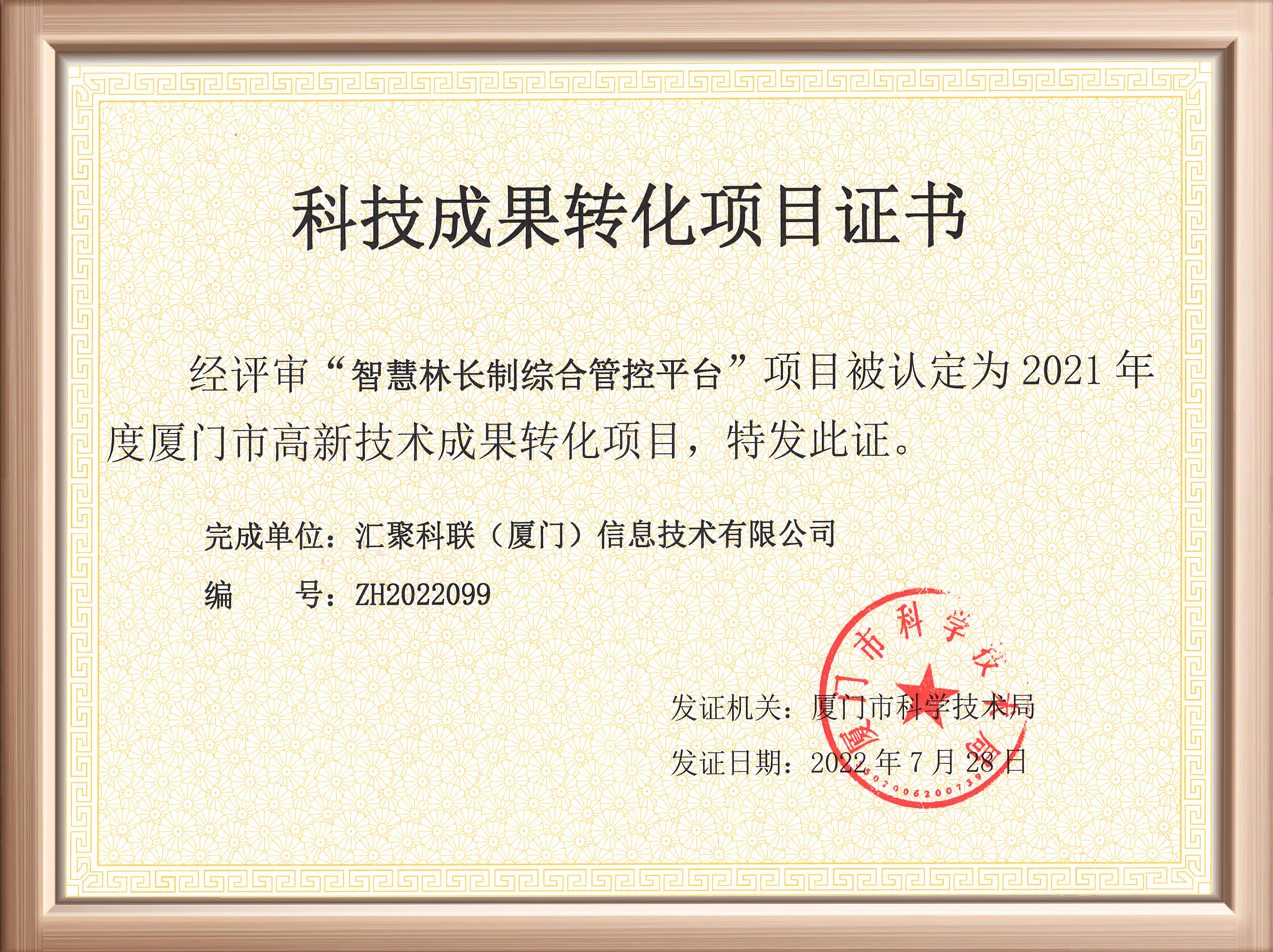 近日,匯聚科聯(lián)收到廈門市科技局頒發(fā)的“科技成果轉化項目證書”,公司“智慧林長制綜合管控平臺”經(jīng)過評選,成功被認定為2021年度廈門市高新技術成果轉化項目。